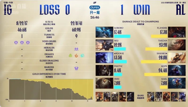 20分钟:IG集火想要击杀沙皇但是被对方丝血逃脱,AL集结反打击杀对方四人打出零换四